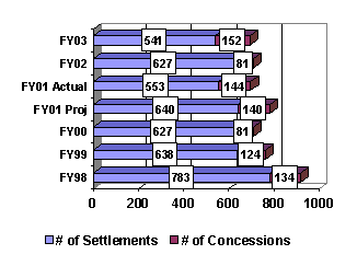 Discussion: Of the 2,350 cases projected to be subject to ADR, approximately 1,598 were settled using ADR. During FY 2001, Department attorneys reported that 65% of dispute resolution proceedings produced settlements. Moreover, even when cases did not settle as a result of ADR, many attorneys found that ADR was still an effective way to narrow the issues for trial and make them better prepared to litigate. |