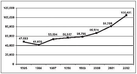Trends in Consequences of UseThe consequences of methamphetamine use as evidenced by Emergency Department (ED) mentions and treatment admissions are trending upward. Drug Abuse Warning Network (DAWN) data show that the estimated number of ED mentions for methamphetamine fluctuated but increased overall from 15,933 in 1995 to 17,696 in 2002 (see Figure 8). TEDS data show that the number of methamphetamine-related admissions to publicly funded treatment facilities nearly doubled from 47,683 in 1995 to 81,799 in 2001 and increased again to 104,481 in 2002 (see Figure 9).