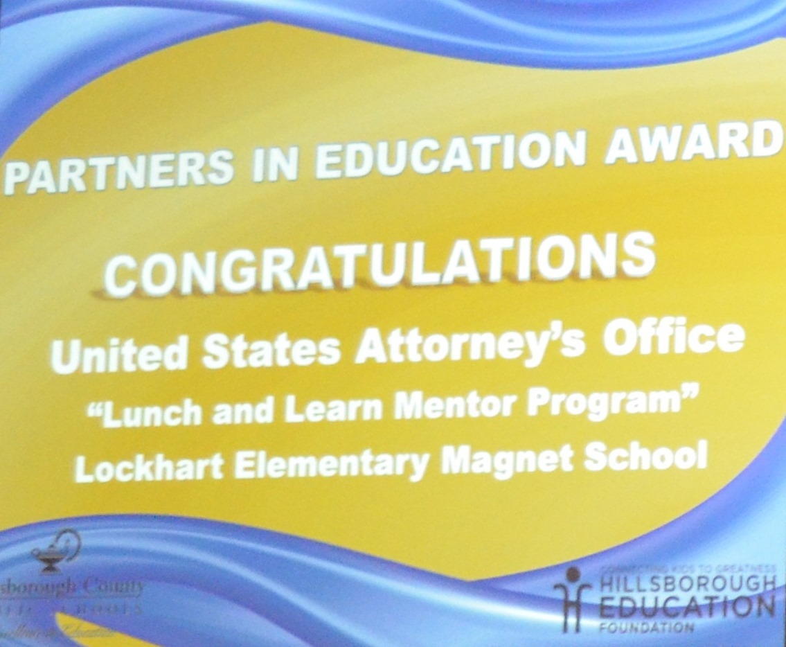Hillsborough County Public Schools presented the United States Attorney's Office with the Department of Education Family and Community Involvement Exemplary Program Award in recognition of the Lockhart Magnet School Lunch and Learn Mentoring Program. Mr. Thaddeus Bullard, aka WWE superstar Titus O'Neil, served as the keynote speaker for the 2016 Volunteer Awards.